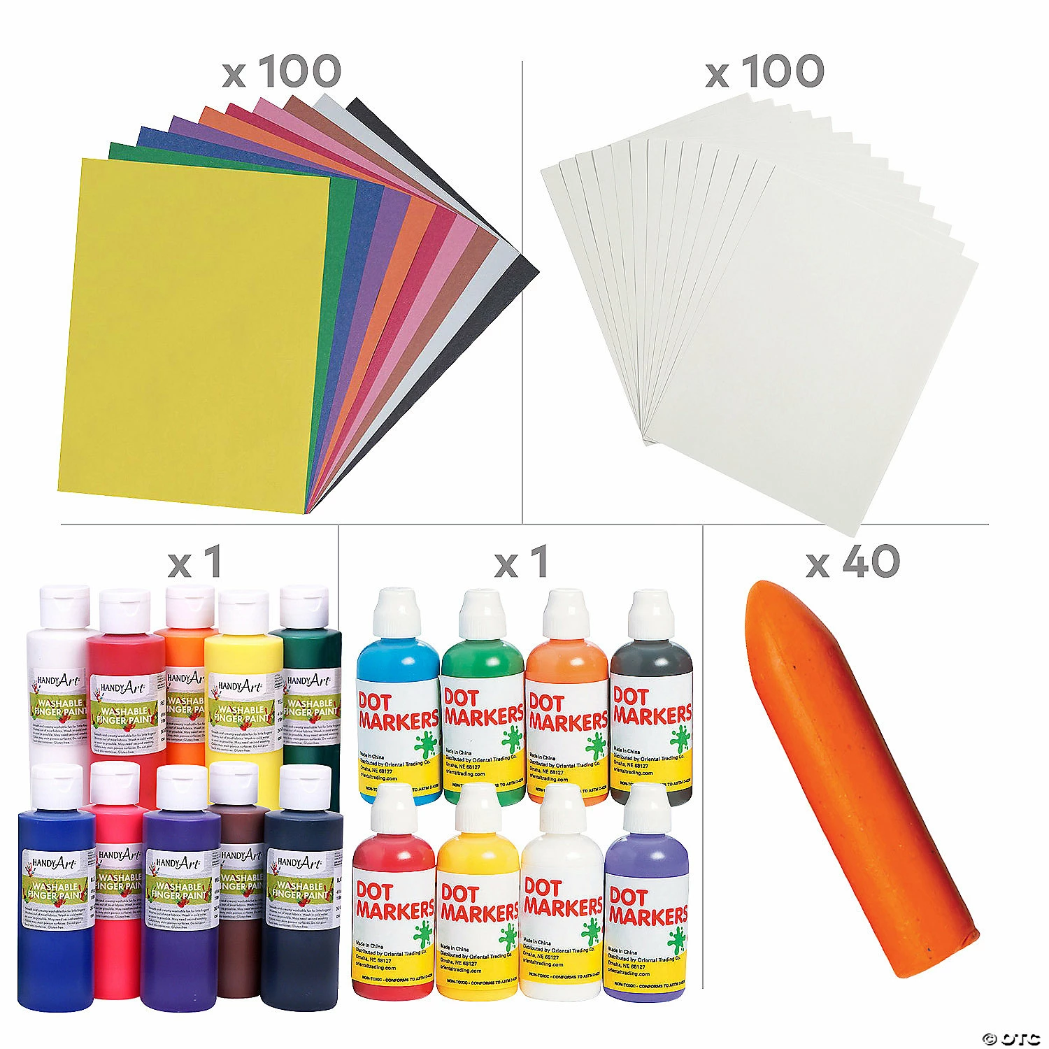 Need a refresh on your arts and crafts supplies at home or in the classroom? This kit can be a great starter or a re-stock for a crafty corner. Featuring plenty of paint, crayons, paper and more, this kit is full of artistic possibilities! Little artists will feel inspired to create some pieces they can show off to parents and friends. (258 pcs. per unit) Assortment may vary.Includes:โข 40 8-Color Chubby Crayons (2 1/4″ Safe and non-toxic. Conforms to ASTM D-4236.)โข 10 Washable Finger Paints (4″ 4 oz. Safe, non-toxic and washable. Conforms to ASTM D-4236.)โข 8 Make a Dot Markers (3 3/4″ Safe, non-toxic and washable. Conforms to ASTM D-4236.)โข 100 Sunworks Construction Papers (9″ x 12″)โข 100 SunWorks White Construction Papers (9″ x 12″)